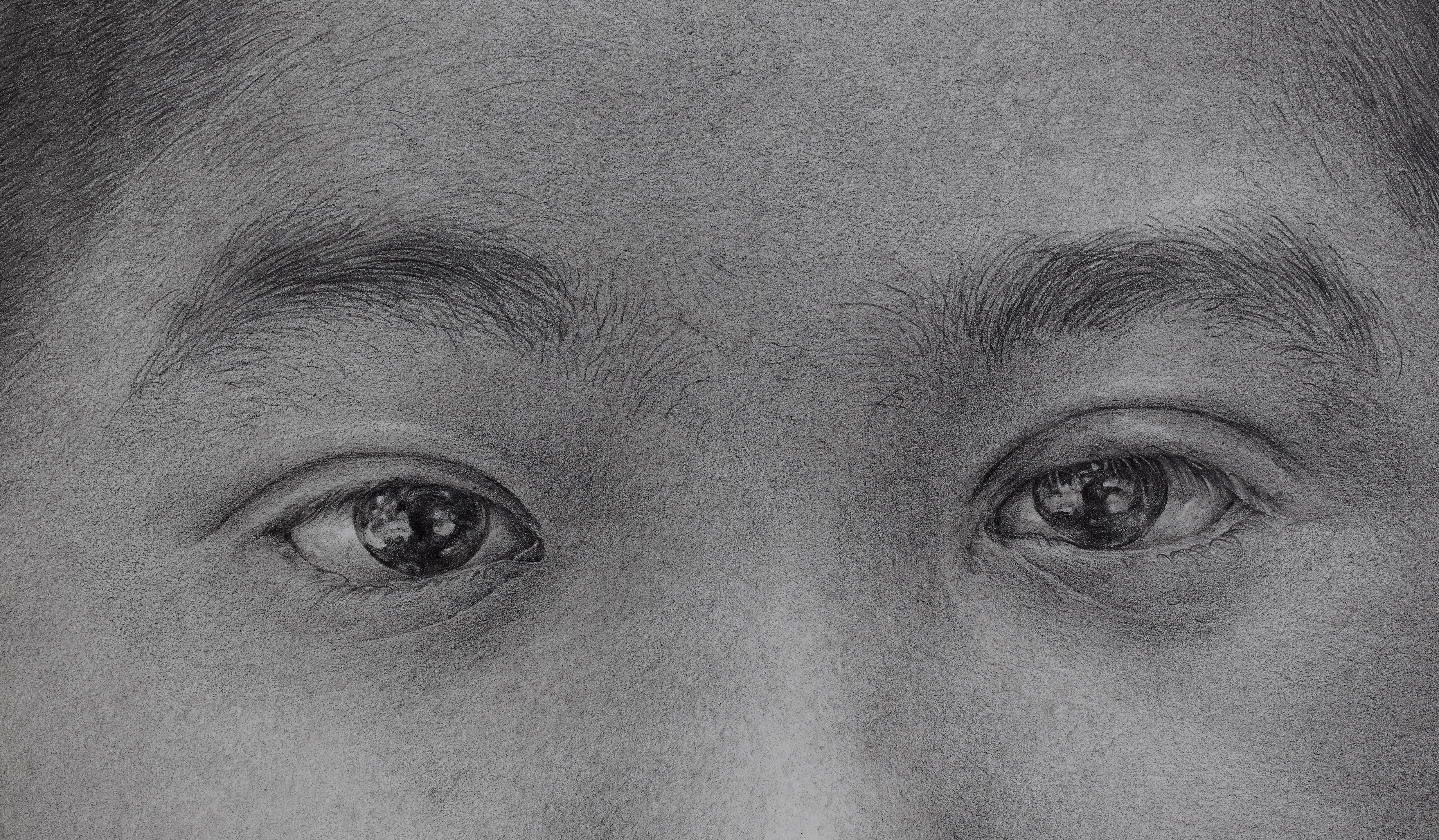 這張肖像的背景是學校校園,從肖像畫的瞳孔中,可以看見校園的樹木與操場概況。