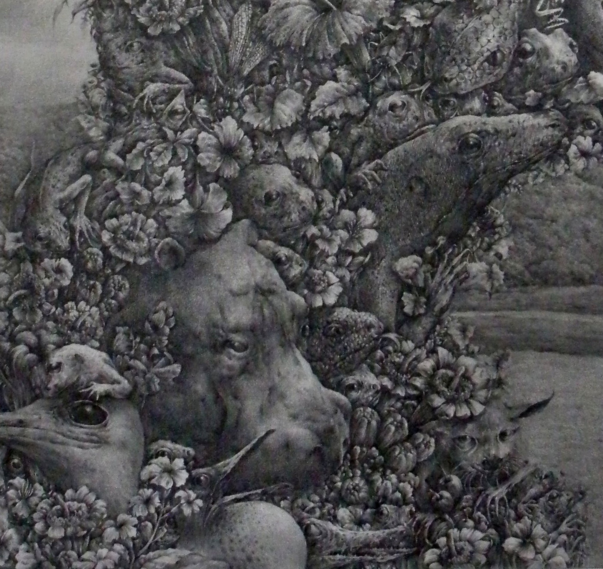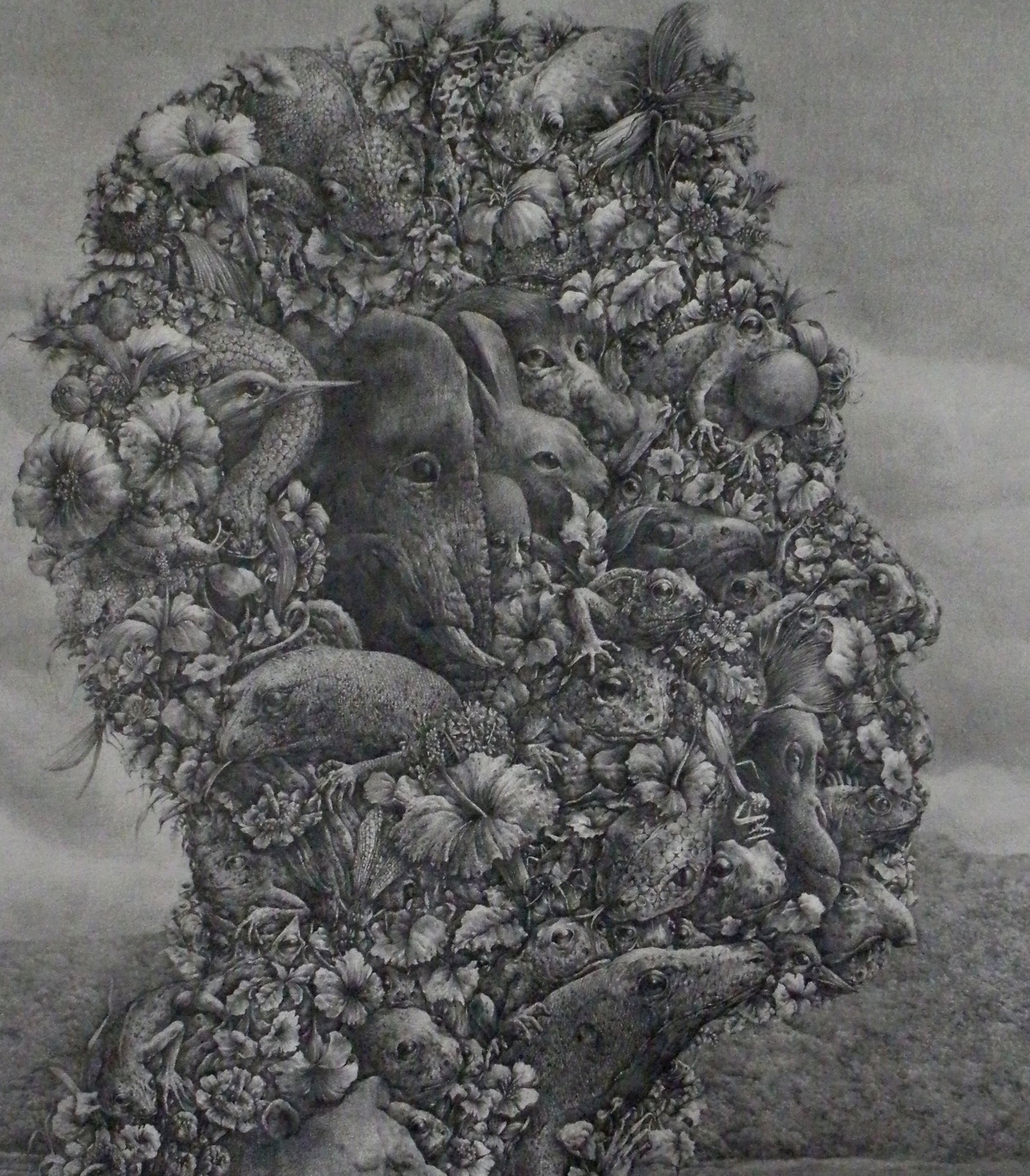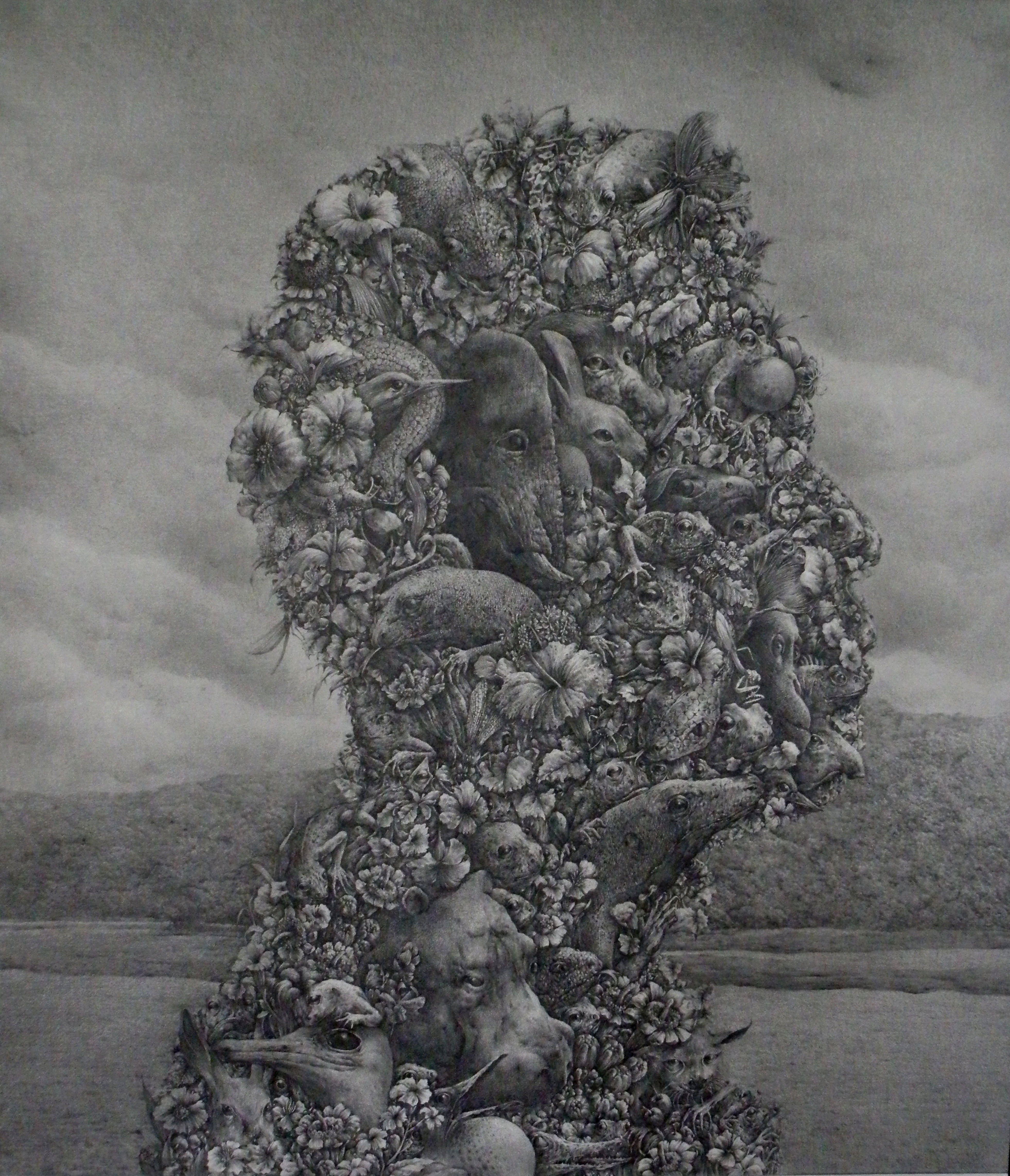 This artwork depicts my imagination of myself. I imagine being composed of various animals and plants, and I believe these composite images about myself are truer to me than the reflection in the mirror.